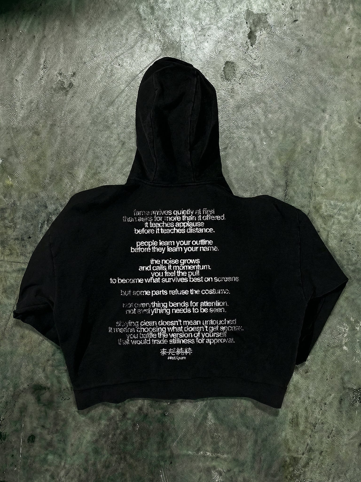 Designed to sit slightly above traditional hoodie length while maintaining width through the body and sleeves for a modern, oversized cropped profile.